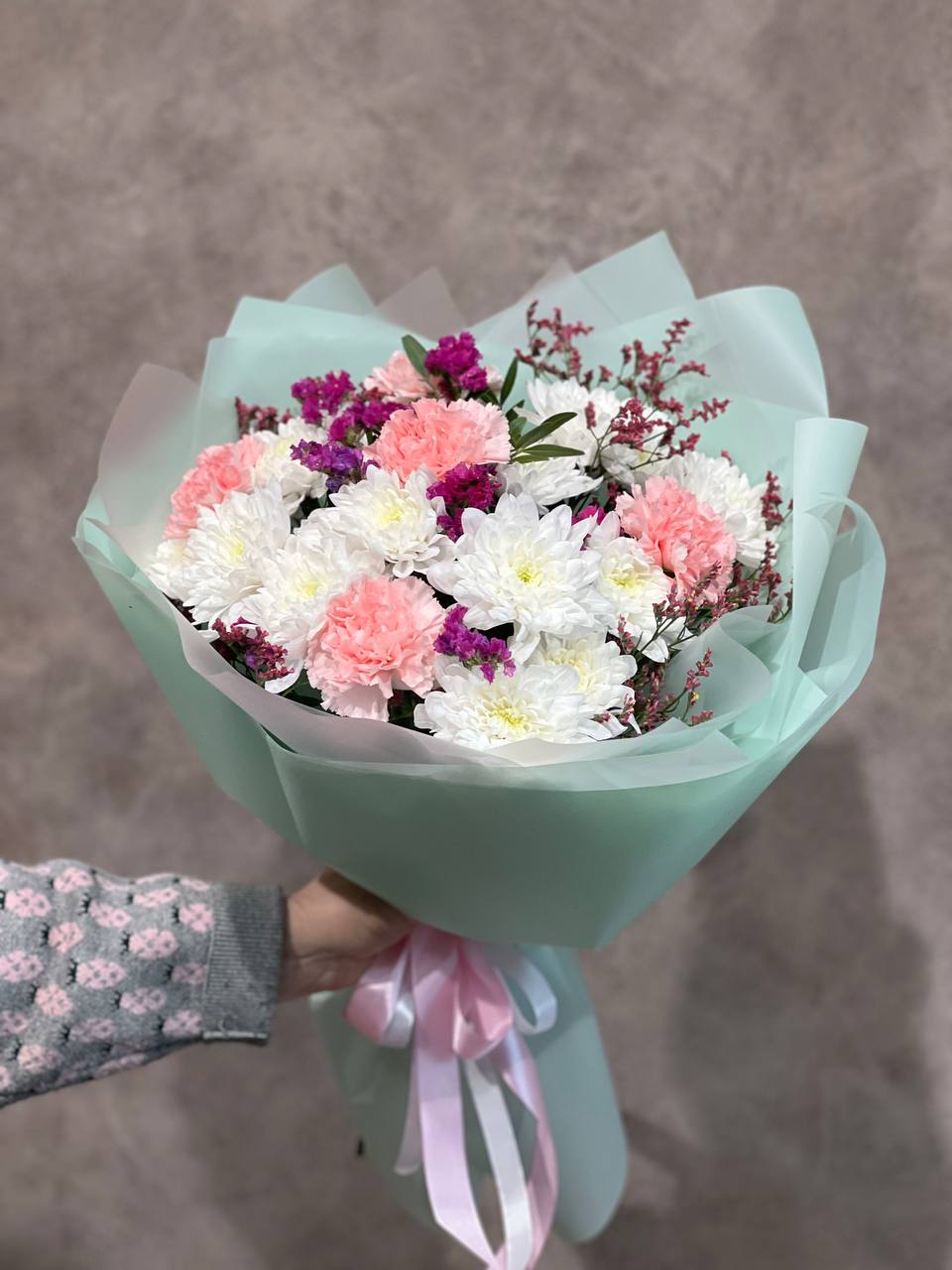 Categories: September 1, 14 february, 23 february, Bouquet for Mothers, Bouquet for newborns, Bouquet for birthday, Bouquet for the wedding, Bouquets, Bouquets of carnations, Bouquets for March 8, Chrysanthemum bouquets Description